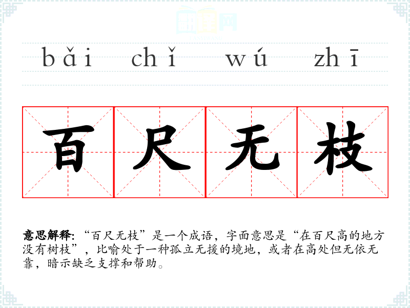 “百尺无枝”是一个成语,字面意思是“在百尺高的地方没有树枝”,比喻处于一种孤立无援的境地,或者在高处但无依无靠,暗示缺乏支撑和帮助。