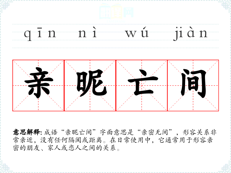 成语“亲昵亡间”字面意思是“亲密无间”,形容关系非常亲近,没有任何隔阂或距离。在日常使用中,它通常用于形容亲密的朋友、家人或恋人之间的关系。