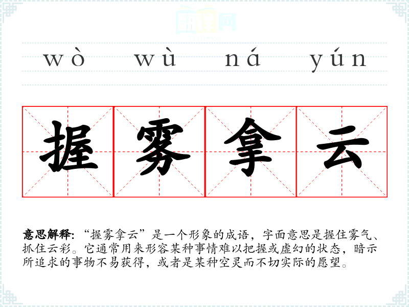 - 虚无缥缈:形容事物不切实际,难以捉摸,和“握雾拿云”在意象上相似。