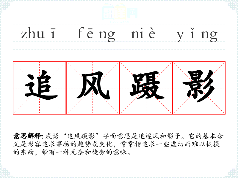 成语“追风蹑影”字面意思是追逐风和影子。它的基本含义是形容追求事物的趋势或变化,常常指追求一些虚幻而难以捉摸的东西,带有一种无奈和徒劳的意味。