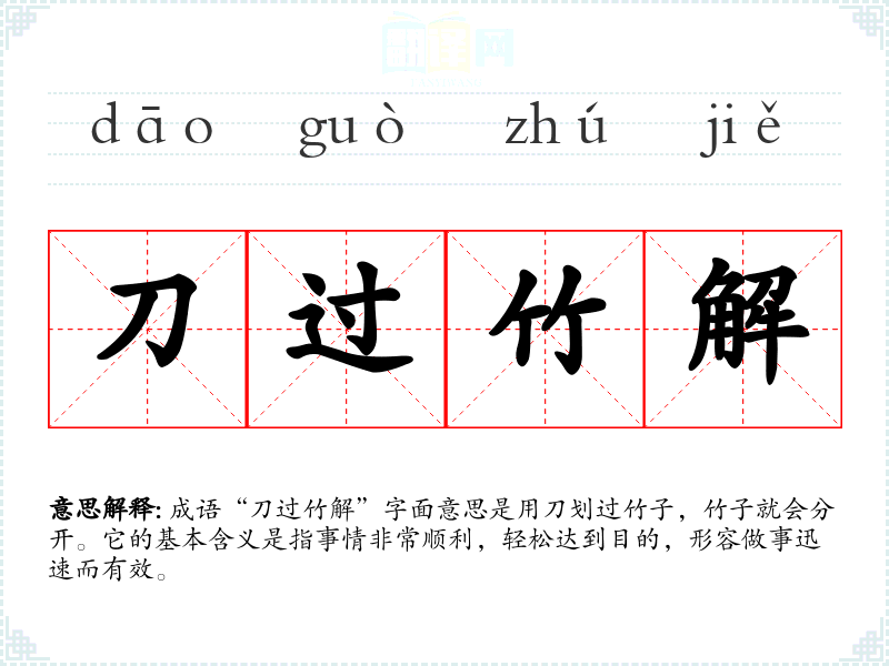 成语“刀过竹解”字面意思是用刀划过竹子,竹子就会分开。它的基本含义是指事情非常顺利,轻松达到目的,形容做事迅速而有效。