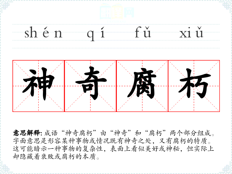成语“神奇腐朽”由“神奇”和“腐朽”两个部分组成。字面意思是形容某种事物或情况既有神奇之处,又有腐朽的特质。这可能暗示一种事物的复杂性,表面上看似美好或神秘,但实际上却隐藏着衰败或腐朽的本质。