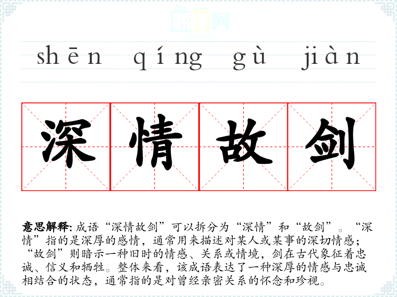 成语“深情故剑”可以拆分为“深情”和“故剑”。“深情”指的是深厚的感情,通常用来描述对某人或某事的深切情感;“故剑”则暗示一种旧时的情感、关系或情境,剑在古代象征着忠诚、信义和牺牲。整体来看,该成语表达了一种深厚的情感与忠诚相结合的状态,通常指的是对曾经亲密关系的怀念和珍视。