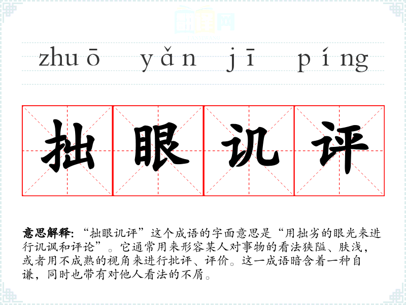 “拙眼讥评”这个成语的字面意思是“用拙劣的眼光来进行讥讽和评论”。它通常用来形容某人对事物的看法狭隘、肤浅,或者用不成熟的视角来进行批评、评价。这一成语暗含着一种自谦,同时也带有对他人看法的不屑。