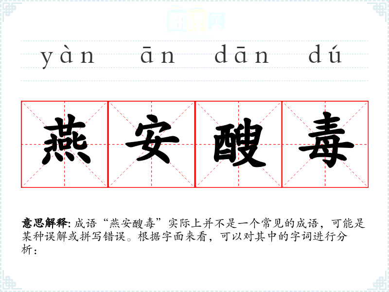 成语“燕安醙毒”实际上并不是一个常见的成语,可能是某种误解或拼写错误。根据字面来看,可以对其中的字词进行分析: