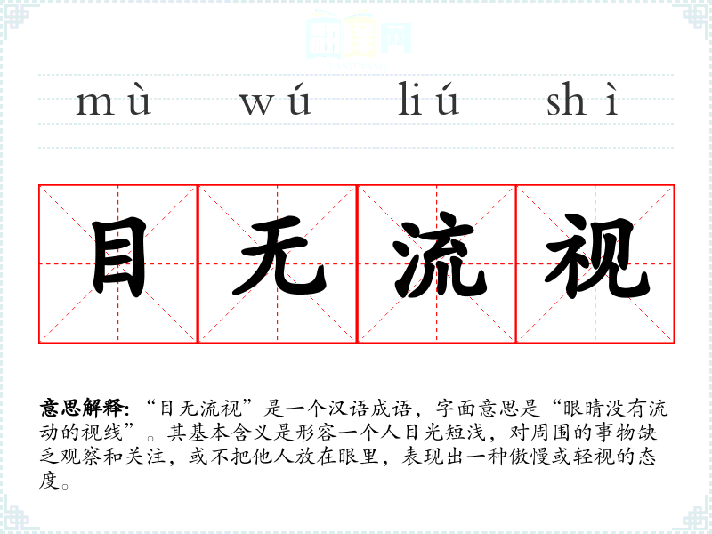 在不同的语境中,“目无流视”可以用于文学作品中,描写一个人的傲慢态度;在日常对话中,可以用来形容那些对他人缺乏尊重的人;在演讲中,可以作为批评某些行为或态度的依据,强调对他人和社会的关注。