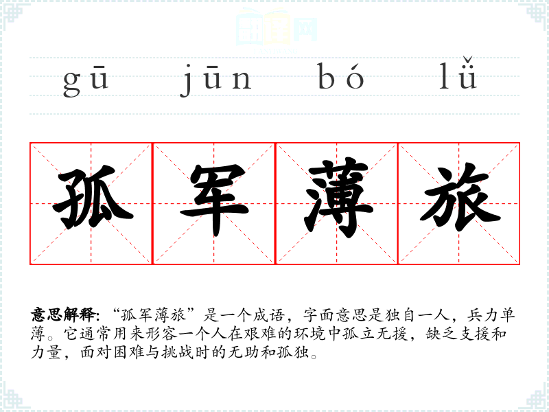 “孤军旅”是一个成语,字面意思是独自一人,兵力单。它通常用来形容一个人在艰难的环境中孤立无援,缺乏支援和力量,面对困难与挑战时的无助和孤独。