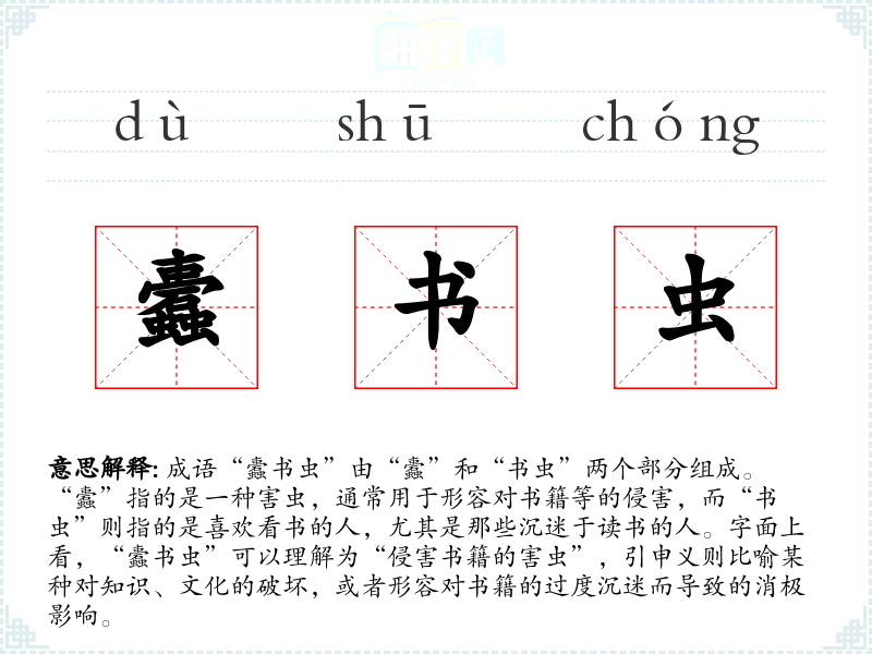 成语“蠹书虫”由“蠹”和“书虫”两个部分组成。“蠹”指的是一种害虫,通常用于形容对书籍等的侵害,而“书虫”则指的是喜欢看书的人,尤其是那些沉迷于读书的人。字面上看,“蠹书虫”可以理解为“侵害书籍的害虫”,引申义则比喻某种对知识、文化的破坏,或者形容对书籍的过度沉迷而导致的消极影响。