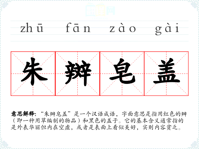 “朱辬皂盖”是一个汉语成语,字面意思是指用红色的辬(即一种用草编制的物品)和黑色的盖子。它的基本含义通常指的是外表华丽但内在空虚,或者是表面上看似美好,实则内容贫乏。