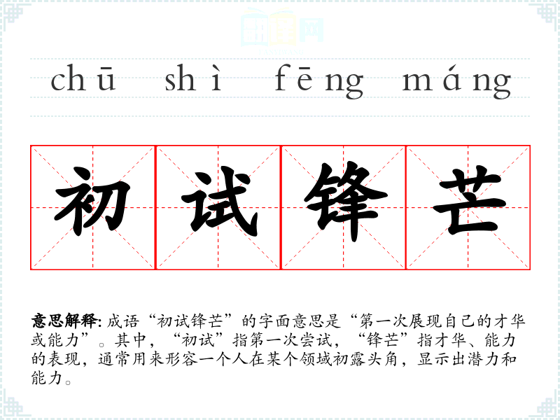 成语“初试锋芒”的字面意思是“第一次展现自己的才华或能力”。其中,“初试”指第一次尝试,“锋芒”指才华、能力的表现,通常用来形容一个人在某个领域初露头角,显示出潜力和能力。