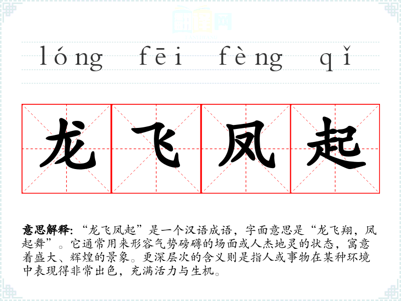 “龙飞凤起”是一个汉语成语,字面意思是“龙飞翔,凤起舞”。它通常用来形容气势磅礴的场面或人杰地灵的状态,寓意着盛大、辉煌的景象。更深层次的含义则是指人或事物在某种环境中表现得非常出色,充满活力与生机。