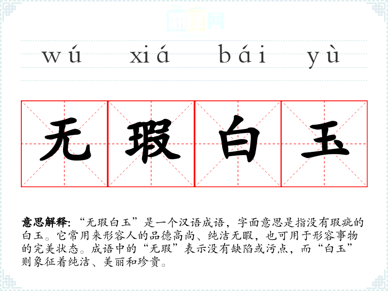 “无瑕白玉”是一个汉语成语,字面意思是指没有瑕疵的白玉。它常用来形容人的品德高尚、纯洁无暇,也可用于形容事物的完美状态。成语中的“无瑕”表示没有缺陷或污点,而“白玉”则象征着纯洁、美丽和珍贵。