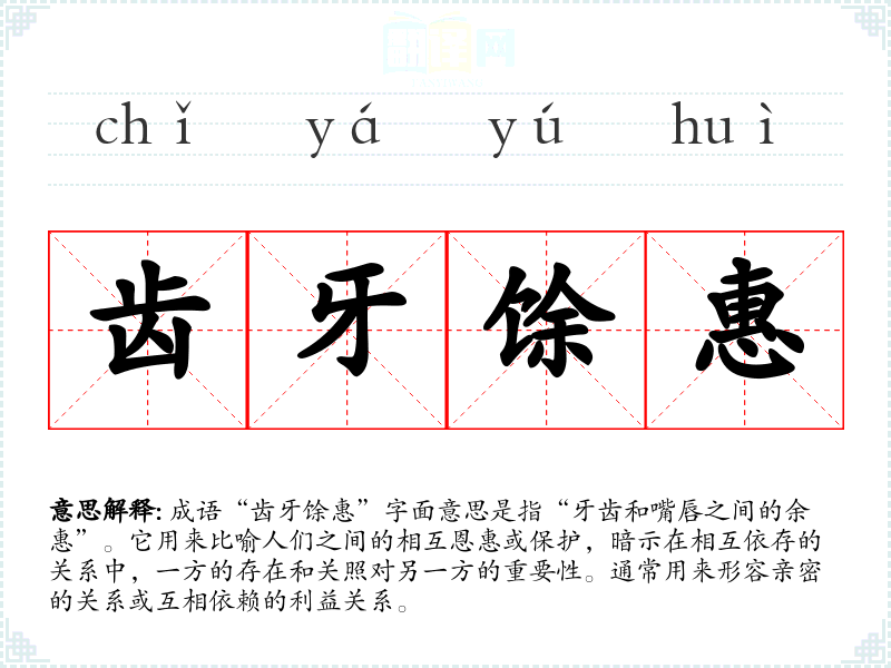 成语“齿牙馀惠”字面意思是指“牙齿和嘴唇之间的余惠”。它用来比喻人们之间的相互恩惠或保护,暗示在相互依存的关系中,一方的存在和关照对另一方的重要性。通常用来形容亲密的关系或互相依赖的利益关系。