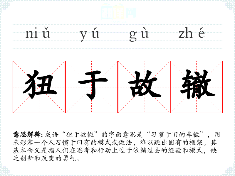 成语“狃于故辙”的字面意思是“惯于旧的车辙”,用来形容一个人惯于旧有的模式或做法,难以跳出固有的框架。其基本含义是指人们在思考和行动上过于依赖过去的经验和模式,缺乏创新和改变的勇气。