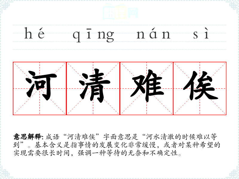 成语“河清难俟”字面意思是“河水清澈的时候难以等到”。基本含义是指事情的发展变化非常缓慢,或者对某种希望的实现需要很长时间,强调一种等待的无奈和不确定性。
