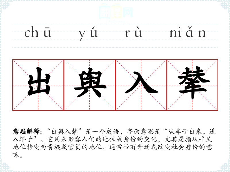 “出舆入辇”是一个成语,字面意思是“从车子出来,进入轿子”。它用来形容人们的地位或身份的变化,尤其是指从平民地位转变为贵族或官员的地位,通常带有升迁或改变社会身份的意味。