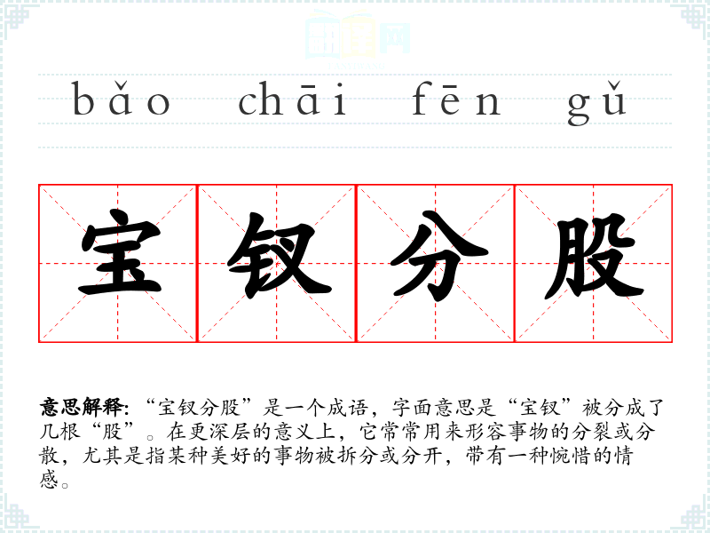 “宝钗分股”是一个成语,字面意思是“宝钗”被分成了几根“股”。在更深层的意义上,它常常用来形容事物的分裂或分散,尤其是指某种美好的事物被拆分或分开,带有一种惋惜的情感。