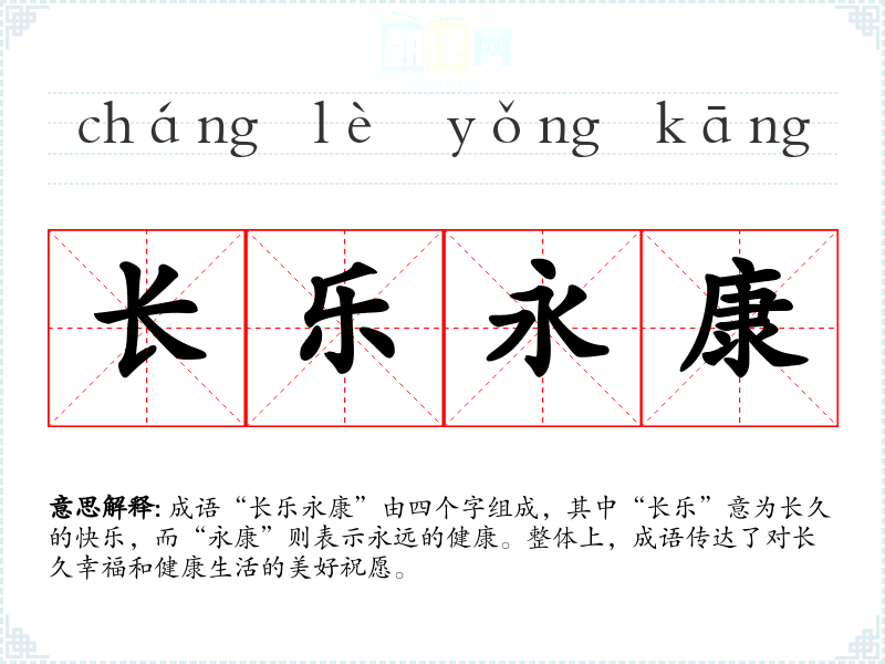 成语“长乐永康”由四个字组成,其中“长乐”意为长久的快乐,而“永康”则表示永远的健康。整体上,成语传达了对长久幸福和健康生活的美好祝愿。