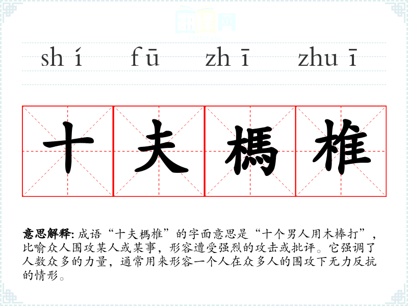成语“十夫榪椎”的字面意思是“十个男人用木棒打”,比喻众人围攻某人或某事,形容遭受强烈的攻击或批评。它强调了人数众多的力量,通常用来形容一个人在众多人的围攻下无力反抗的情形。