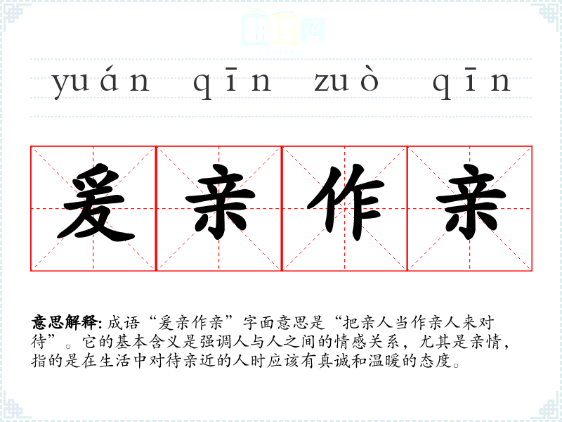 成语“爰亲作亲”字面意思是“把亲人当作亲人来对待”。它的基本含义是强调人与人之间的情感关系,尤其是亲情,指的是在生活中对待亲近的人时应该有真诚和温暖的态度。