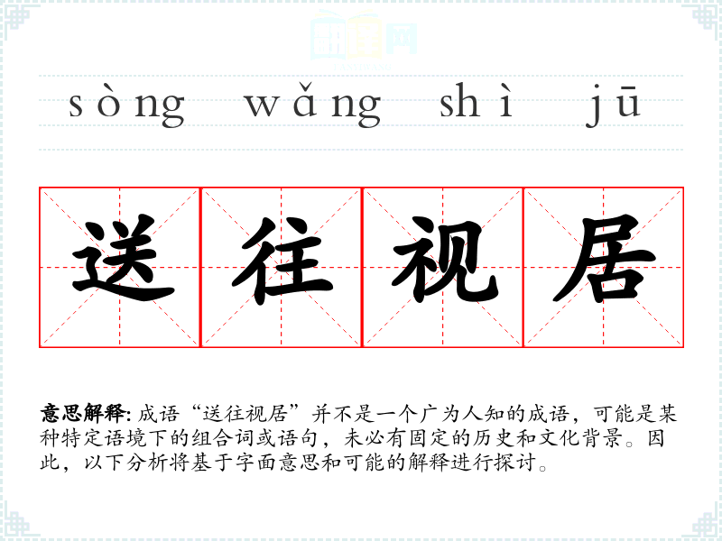 - 历史背景:由于“送往视居”不是传统成语,因此没有明确的历史背景或文学出处。可以推测其可能源于现代语言的表达,或是某种特定语境下的使用。