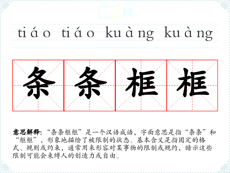 “条条框框”是一个汉语成语,字面意思是指“条条”和“框框”,形象地描绘了被限制的状态。基本含义是指固定的格式、规则或约束,通常用来形容对某事物的限制或规约,暗示这些限制可能会束缚人的创造力或自由。