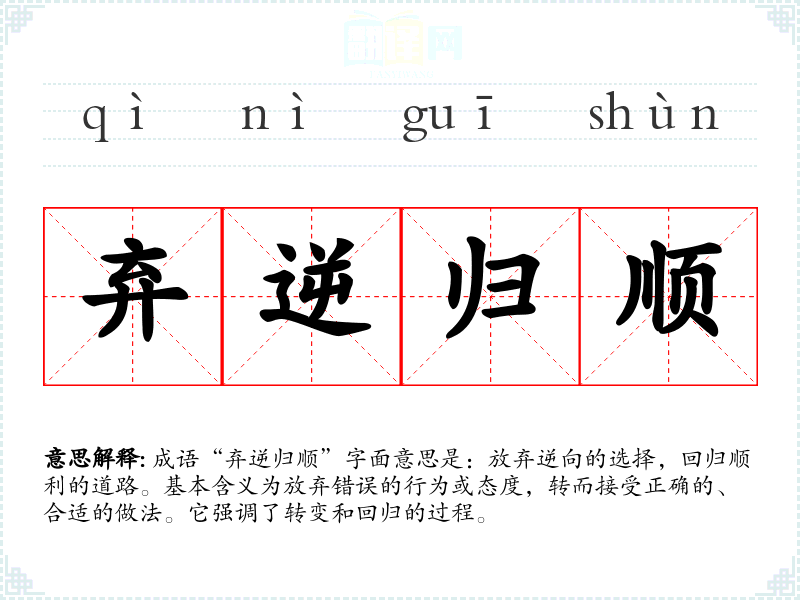 成语“弃逆归顺”字面意思是:放弃逆向的选择,回归顺利的道路。基本含义为放弃错误的行为或态度,转而接受正确的、合适的做法。它强调了转变和回归的过程。