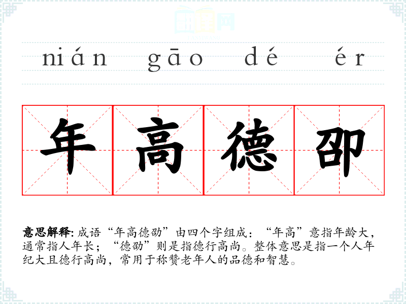 成语“年高德劭”由四个字组成:“年高”意指年龄大,通常指人年长;“德劭”则是指德行高尚。整体意思是指一个人年纪大且德行高尚,常用于称赞老年人的品德和智慧。