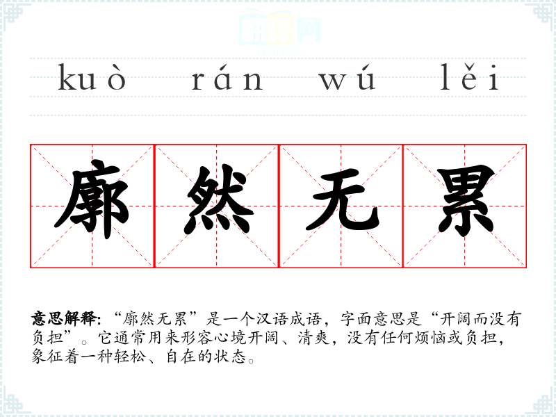 “廓然无累”是一个汉语成语,字面意思是“开阔而没有负担”。它通常用来形容心境开阔、清爽,没有任何烦恼或负担,象征着一种轻松、自在的状态。
