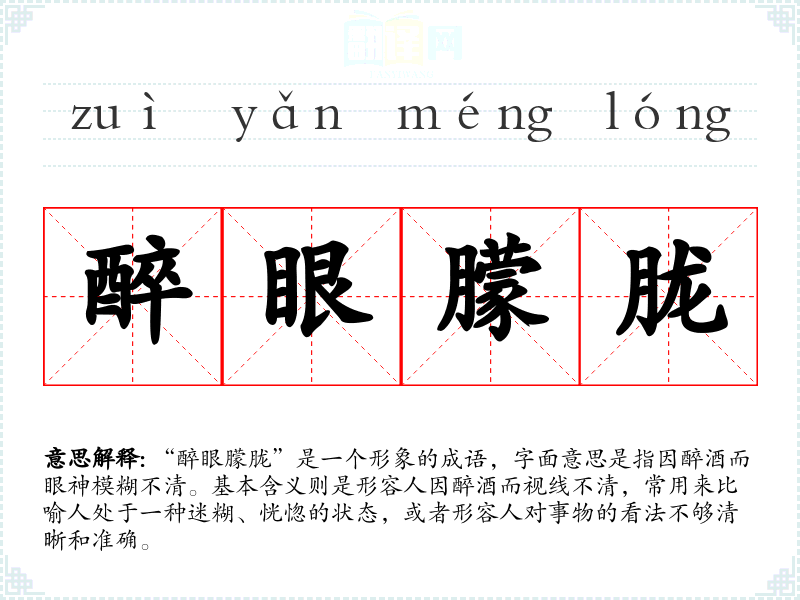 | 醉眼蒙胧 | 形容醉后两眼模糊不清的样子 |