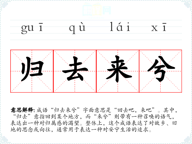 成语“归去来兮”字面意思是“回去吧,来吧”。其中,“归去”意指回到某个地方,而“来兮”则带有一种召唤的语气,表达出一种对归属感的渴望。整体上,这个成语表达了对故乡、旧地的思念或向往,通常用于表达一种对安宁生活的追求。