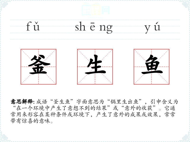 成语“釜生鱼”字面意思为“锅里生出鱼”,引申含义为“在一个环境中产生了意想不到的结果”或“意外的收获”。它通常用来形容在某种条件或环境下,产生了意外的成果或效果,常常带有惊喜的意味。