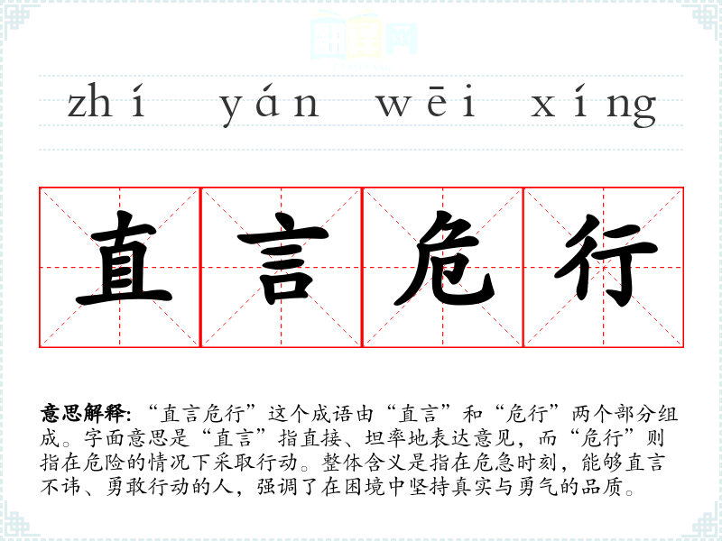 “直言危行”这个成语由“直言”和“危行”两个部分组成。字面意思是“直言”指直接、坦率地表达意见,而“危行”则指在危险的情况下采取行动。整体含义是指在危急时刻,能够直言不讳、勇敢行动的人,强调了在困境中坚持真实与勇气的品质。