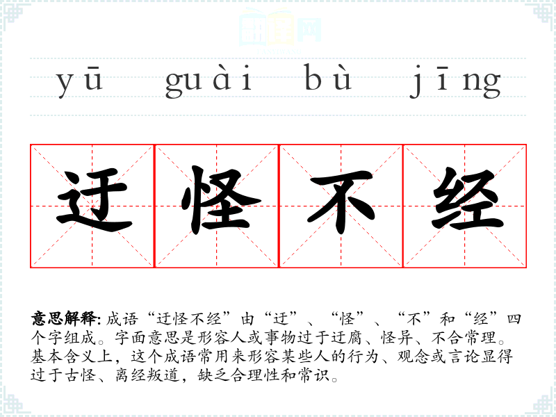 成语“迂怪不经”由“迂”、“怪”、“不”和“经”四个字组成。字面意思是形容人或事物过于迂腐、怪异、不合常理。基本含义上,这个成语常用来形容某些人的行为、观念或言论显得过于古怪、离经叛道,缺乏合理性和常识。