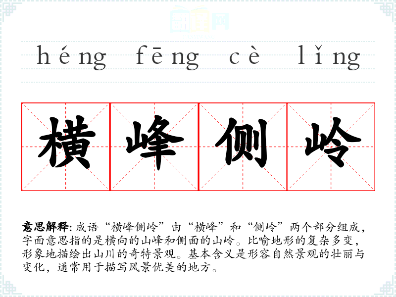 “横峰侧岭”出自于古代文人对山水的描绘,尤其是在山水诗和山水画中频繁出现。虽然没有确切的文学出处,但可以认为它反映了**传统文化中对山水的崇拜和对自然景观的细腻观察。