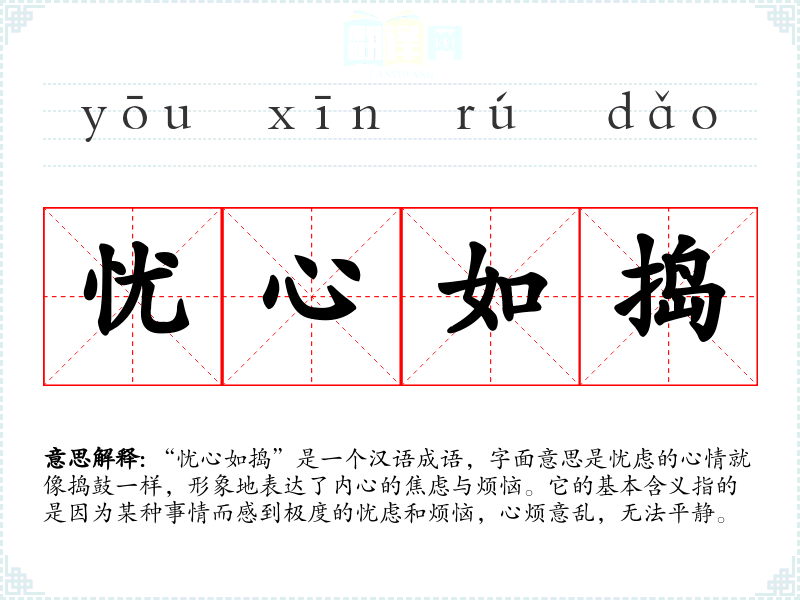 “忧心如捣”是一个汉语成语,字面意思是忧虑的心情就像捣鼓一样,形象地表达了内心的焦虑与烦恼。它的基本含义指的是因为某种事情而感到极度的忧虑和烦恼,心烦意乱,无法平静。