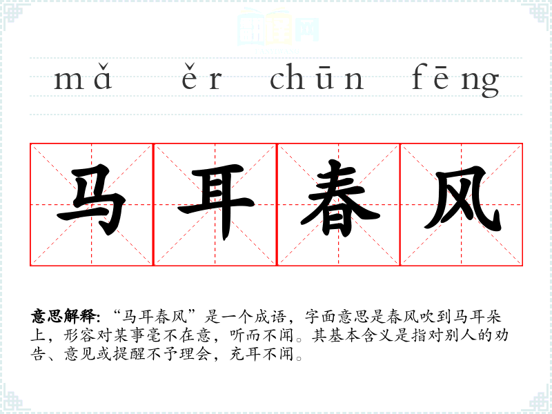 “马耳春风”是一个成语,字面意思是春风吹到马耳朵上,形容对某事毫不在意,听而不闻。其基本含义是指对别人的劝告、意见或提醒不予理会,充耳不闻。