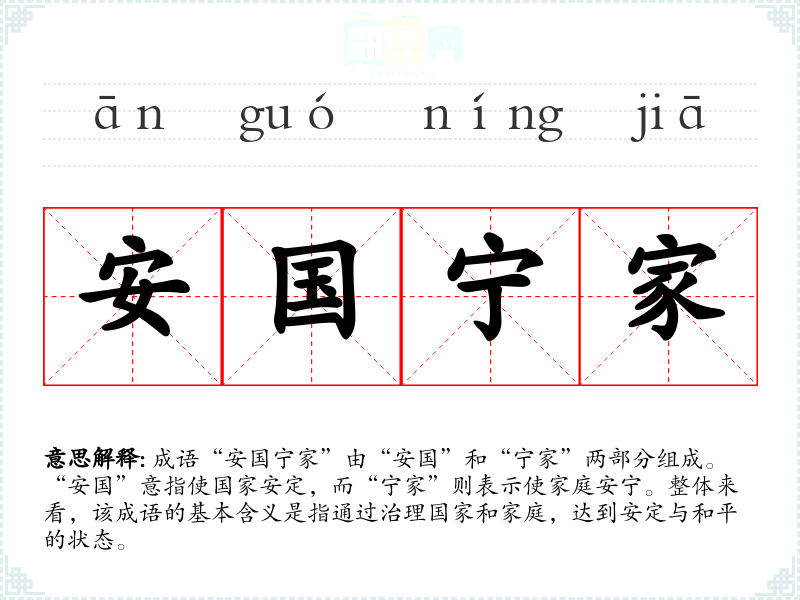 成语“安国宁家”由“安国”和“宁家”两部分组成。“安国”意指使国家安定,而“宁家”则表示使家庭安宁。整体来看,该成语的基本含义是指通过治理国家和家庭,达到安定与和平的状态。