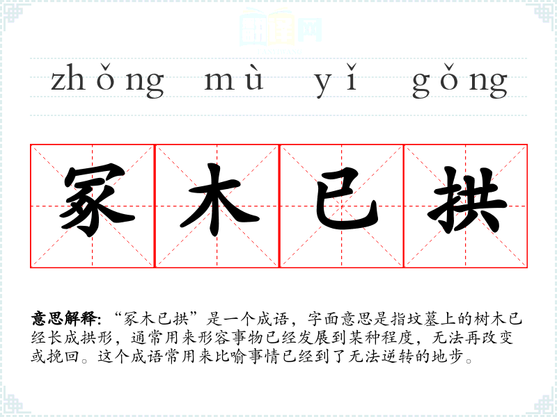 “冢木已拱”是一个成语,字面意思是指坟墓上的树木已经长成拱形,通常用来形容事物已经发展到某种程度,无法再改变或挽回。这个成语常用来比喻事情已经到了无法逆转的地步。