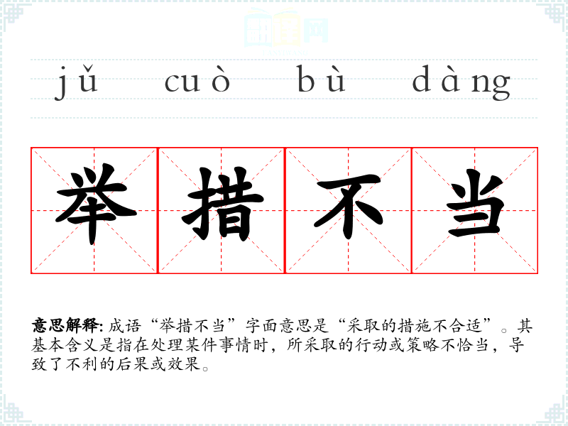 成语“举措不当”字面意思是“采取的措施不合适”。其基本含义是指在处理某件事情时,所采取的行动或策略不恰当,导致了不利的后果或效果。