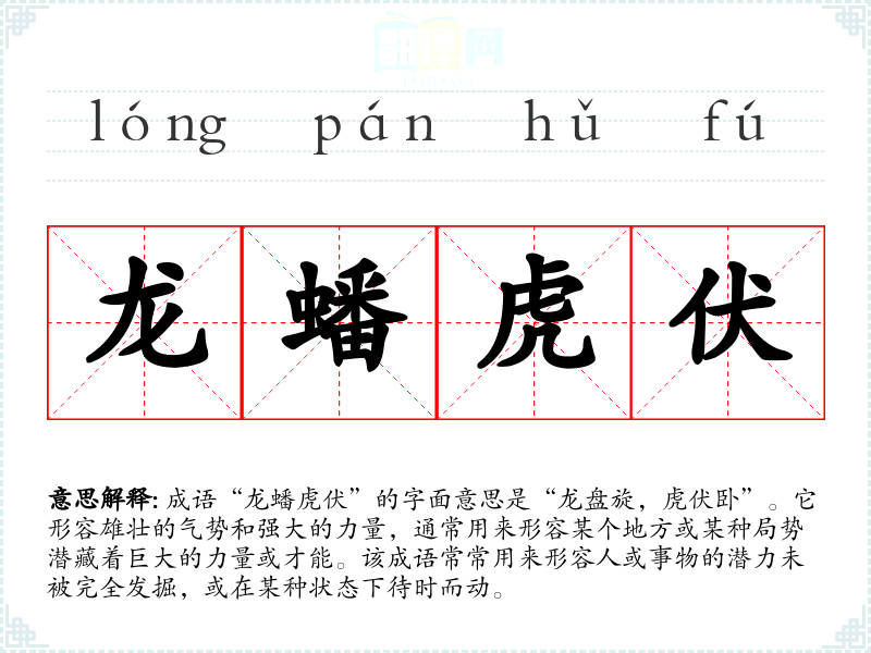 成语“龙蟠虎伏”的字面意思是“龙盘旋,虎伏卧”。它形容雄壮的气势和强大的力量,通常用来形容某个地方或某种局势潜藏着巨大的力量或才能。该成语常常用来形容人或事物的潜力未被完全发掘,或在某种状态下待时而动。