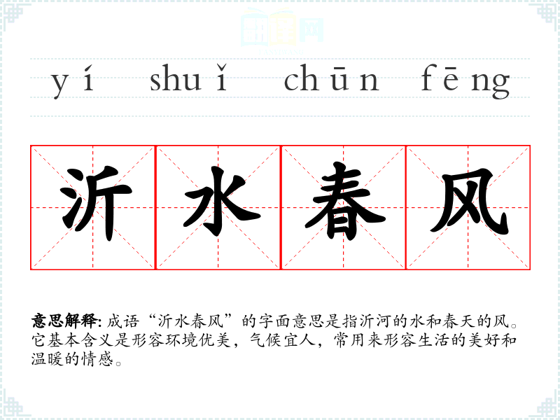 成语“沂水春风”的字面意思是指沂河的水和春天的风。它基本含义是形容环境优美,气候宜人,常用来形容生活的美好和温暖的情感。