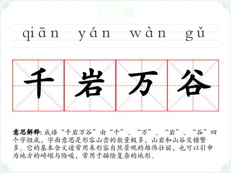 成语“千岩万谷”由“千”、“万”、“岩”、“谷”四个字组成,字面意思是形容山峦的数量极多,山岩和山谷交错繁多。它的基本含义通常用来形容自然景观的雄伟壮丽,也可以引申为地方的崎岖与险峻,常用于描绘复杂的地形。