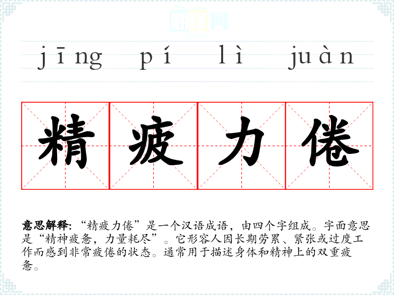 “精疲力倦”是一个汉语成语,由四个字组成。字面意思是“精神疲惫,力量耗尽”。它形容人因长期劳累、紧张或过度工作而感到非常疲倦的状态。通常用于描述身体和精神上的双重疲惫。