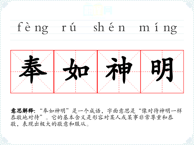 “奉如神明”是一个成语,字面意思是“像对待神明一样恭敬地对待”。它的基本含义是形容对某人或某事非常尊重和恭敬,表现出极大的敬意和服从。