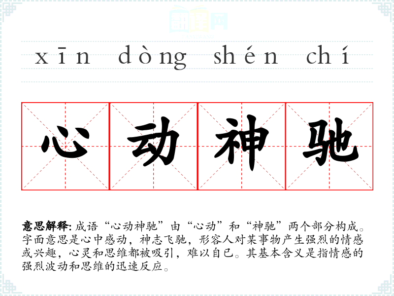 成语“心动神驰”由“心动”和“神驰”两个部分构成。字面意思是心中感动,神志飞驰,形容人对某事物产生强烈的情感或兴趣,心灵和思维都被吸引,难以自已。其基本含义是指情感的强烈波动和思维的迅速反应。