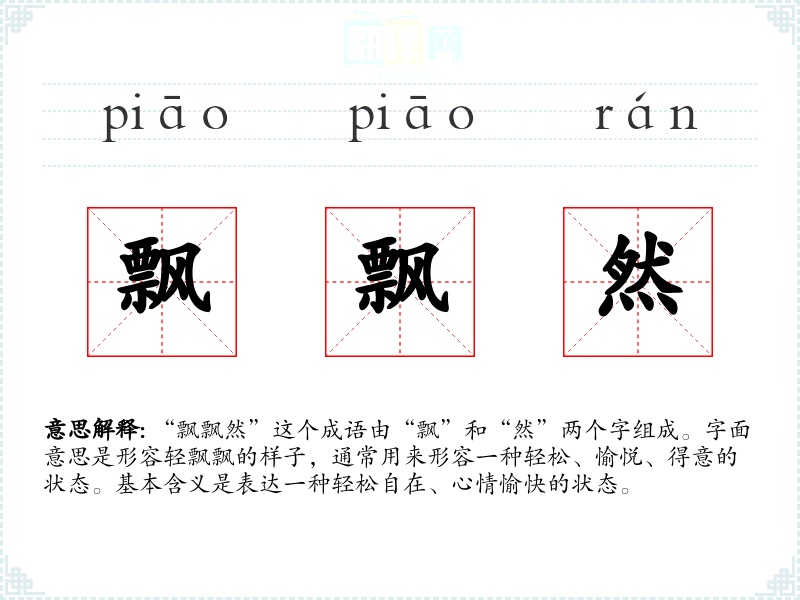 “飘飘然”这个成语由“飘”和“然”两个字组成。字面意思是形容轻飘飘的样子,通常用来形容一种轻松、愉悦、得意的状态。基本含义是表达一种轻松自在、心情愉快的状态。