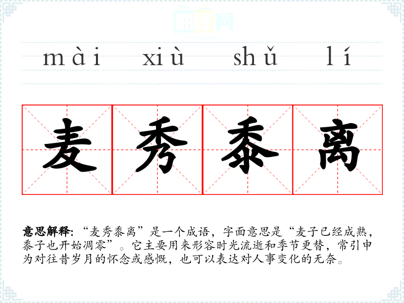 “麦秀黍离”是一个成语,字面意思是“麦子已经成熟,黍子也开始凋零”。它主要用来形容时光流逝和季节更替,常引申为对往昔岁月的怀念或感慨,也可以表达对人事变化的无奈。