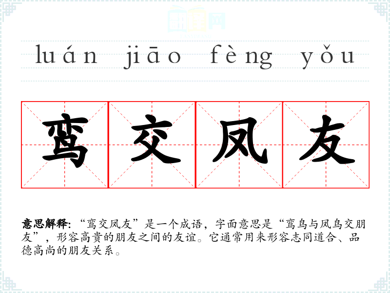 “鸾交凤友”是一个成语,字面意思是“鸾鸟与凤鸟交朋友”,形容高贵的朋友之间的友谊。它通常用来形容志同道合、品德高尚的朋友关系。