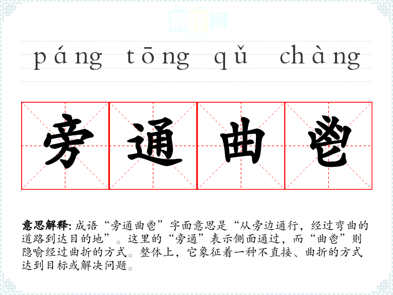 成语“旁通曲鬯”字面意思是“从旁边通行,经过弯曲的道路到达目的地”。这里的“旁通”表示侧面通过,而“曲鬯”则隐喻经过曲折的方式。整体上,它象征着一种不直接、曲折的方式达到目标或解决问题。